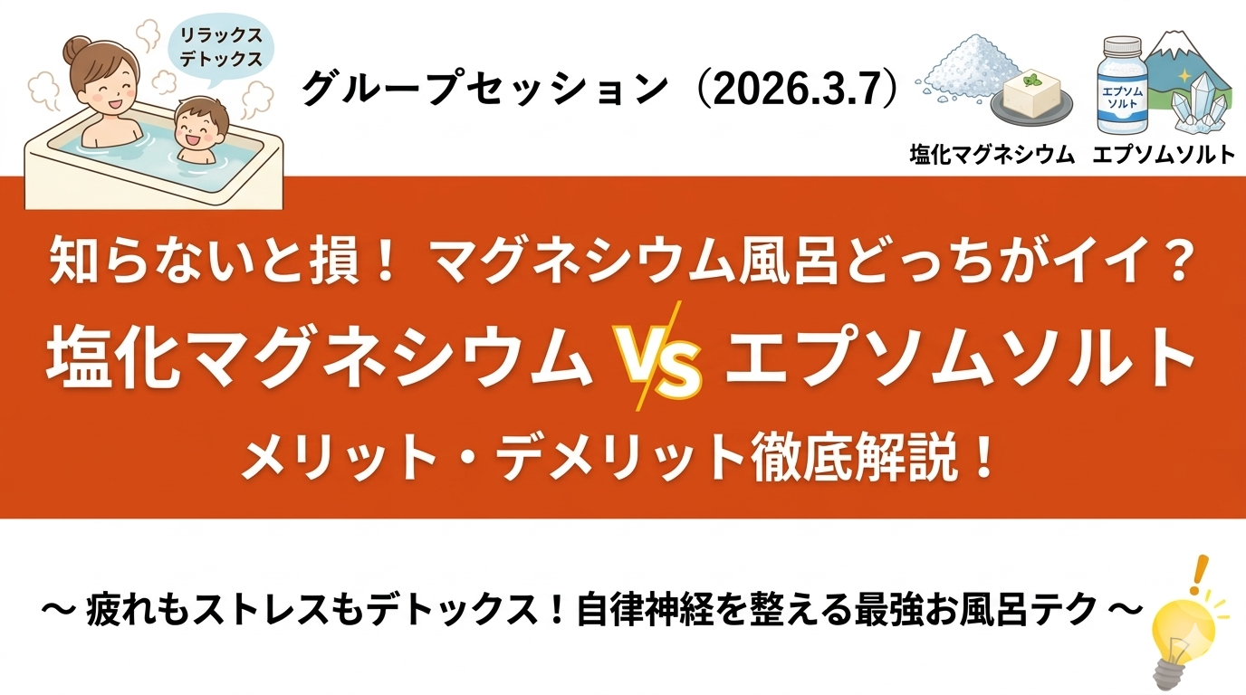 【グループ質問会】マグネシウム風呂について、塩化マグネシウムかエプソムソルトどっちがイイ? グループ質問会 2026.03.162026.03.17 さて今 2026年3月7日に実施した けいのグループセッションの アーカイブとなります! 今回の質問は、 お風呂に入れるマグネシウムは 塩化マグネシウムかエプソムソルト どっちがイイ? です お風呂に入れるマグネシウムについて 悩んでいる方は必見!ですよ(^^♪ ここから先は、会員限定コンテンツとなります。